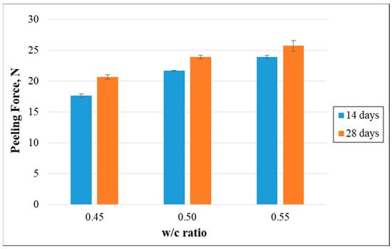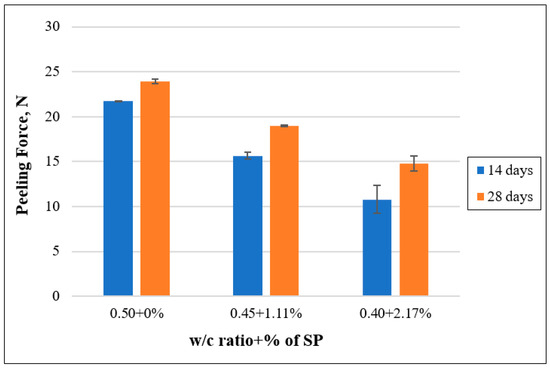 In this phase of the experiment, the w/c ratio was lowered by incorporating the superplasticizer. In order to analyze the effect of SP content, 1.11% of SP by weight of cement was incorporated into the mixtures having a w/c ratio of 0.45 and 2.17% into the mixtures containing a w/c of 0.40. Their results were compared with the standard mortar that had a w/c ratio of 0.50 and 0.0% of SP. Figure 11 clearly illustrates a noteworthy reduction in the peeling force with the increase of superplasticizer content. Over a 28-day curing period, the peeling force decreased by 20.62% as the superplasticizer percentage increased from 0% to 1.11%. Furthermore, the force exhibited a more pronounced decline of 38.29% as the superplasticizer content was further raised from 1.11% to 2.17%.