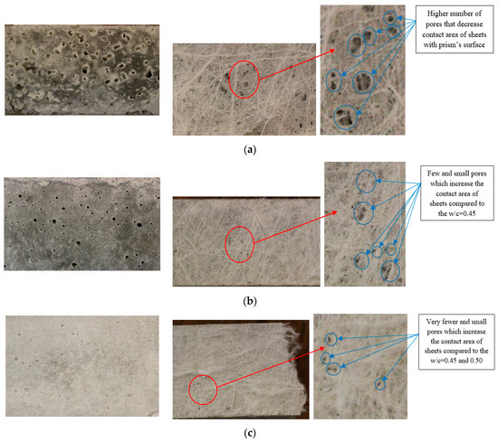 In this part, minor variations in the surface textures of the samples were recorded despite maintaining constant workability. However, the specimens containing a lower w/c ratio and a greater quantity of superplasticizer exhibited larger pores and cavities; this is due to the lower quantity of cement paste on the surfaces of prisms and higher water bleeding, resulting in the reduction of the density of the remaining microfilaments, as shown in Figure 12a. In addition, smaller pores and much smoother surfaces were observed for the prisms with higher w/c ratios and a lower amount of superplasticizer because of a sufficient amount of cement paste and almost zero water bleeding, resulting in denser and thicker layers of remaining microfilaments, as presented in Figure 12b. It could be concluded that the surface texture, volume of cement paste, and water bleeding due to the superplasticizer had the largest effect on the adhesion between sheet and cement mortar.