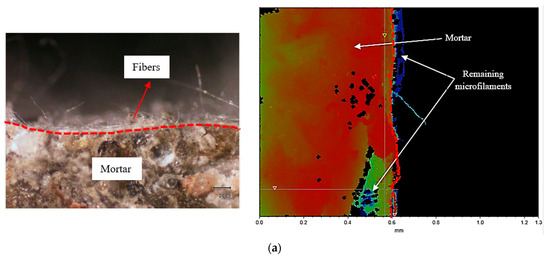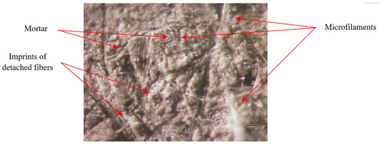 Furthermore, the specimens were analyzed at a closer view to capture the density of residual fibers, mortar composition, and the locations of fibers that were detached during the bond test. The image clearly shows the intersection and adhesion of microfilaments from non-woven sheets within the mortar samples, providing evidence of the strong adhesion between the mortar and the fabric, as shown in Figure 9.