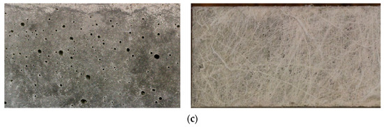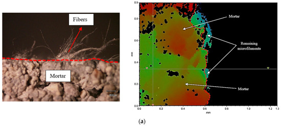 Therefore, in order to have a strong adhesion between non-woven sheets and cementitious materials, it is recommended to have a mortar specimen with a smoother surface, fewer pores and cavities, and mixtures with a decreased amount of superplasticizer and an increased w/c ratio. However, enhancing the w/c ratio also has a limit because, beyond the limit, water bleeding could occur in the matrix, which will definitely decrease the adhesion between the tissue and mortar.
