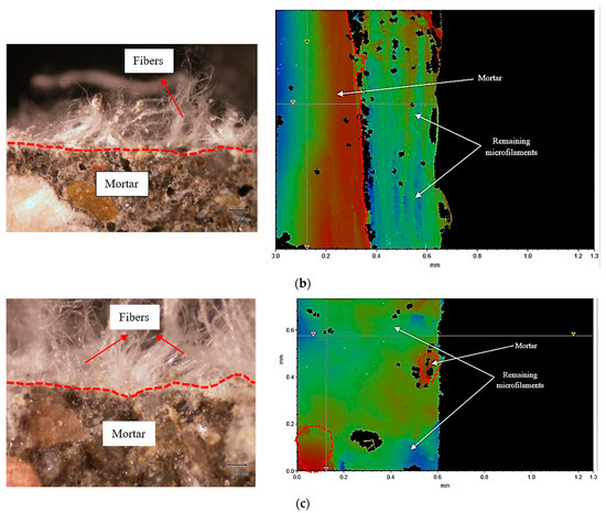 Finally, microscopic and interferometry analyses were carried out to gain deeper insights into the surface characteristics and irregularities of the specimen concentration and thickness of the residual fibers. The outcomes clearly highlight that samples with a water-to-cement ratio of 0.45 exhibited numerous surface irregularities. These irregularities led to a reduction in the interaction between the sheet and prisms, resulting in thinner layers of microfilaments adhering to their surfaces, as presented in Figure 10a. Conversely, for higher w/c ratios, the layer thickness of the remaining fibers substantially increased after the bond test, as demonstrated in Figure 10b,c. In addition, Table 6 shows the layer thickness of the residual microfilaments for the mixtures containing various w/c ratios.