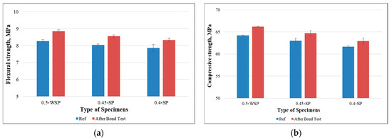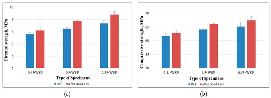 Mechanical strengths of samples after the bond test: (a) flexural strength and (b) compressive strength (effect of w/c ratio).