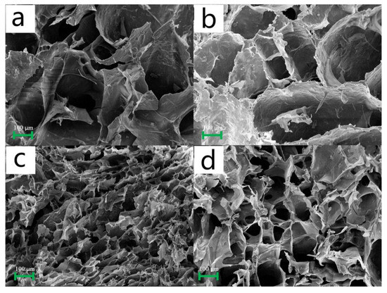 Scanned images (SEM images) of different composite aerogels at 100 times magnification, where figures (a–d) show the SEM images of the S5C1B0.5 aerogel, S5C1B1 aerogel, S5C1B3 aerogel, and S5C1B5 aerogel, respectively.