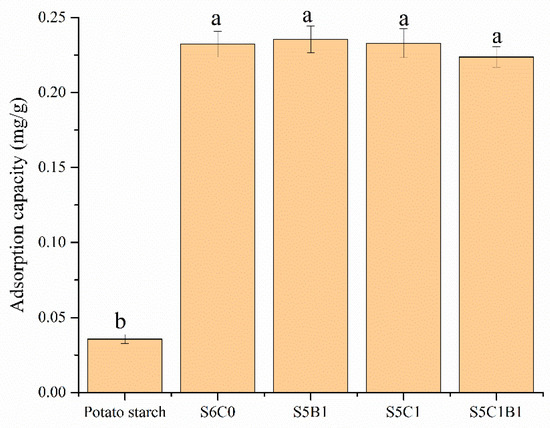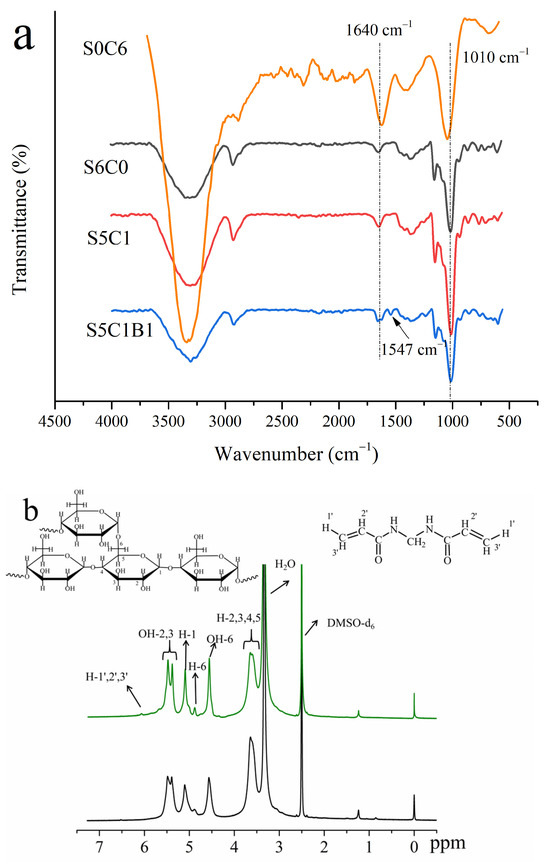 The 1H NMR spectra of the samples are shown in Figure 3b. Peaks arising from the anhydroglucose in the starch and DMAEMA were assigned. H-1,2,3,4,5,6 protons for anhydroglucose, along with the H-1′,2′,3′ protons for MBA, were observed. It showed that a slight decrease (from 3.92 to 3.76, calculated by our previous reports [26,27]) was found in the area of the protons for H-2,3,4,5 from S5C1 to S5C1B1, which meant that part of protons of H-2,3,4,5 were replaced by functional monomers. Meanwhile, the area of the protons for H-6 was slightly reduced (from 0.99 to 0.92). This indicated that all the reactive hydroxyls in anhydroglucose were involved in the copolymerization, which was in line with the mechanism analysis (Supplementary Materials).