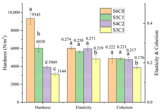 Physical characteristics of aerogels with different starch/cellulose ratios, including: hardness, elasticity, and cohesion. Different letters indicate significant differences of hardness, elasticity and cohesion among the various samples.