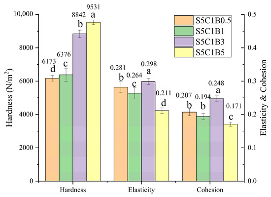 The TPA data obtained at various MBA contents are presented in detail in Figure 5. There was a positive correlation between the MBA content and the hardness value of the aerogel. The data indicated 6173 N/m2 (S5C1B0.5) < 6376 N/m2 (S5C1B1) < 8842 N/m2 (S5C1B3) < 9531 N/m2 (S5C1B5). Thus, the MBA content played a crucial role in the formation of aerogels, and its addition contributed to the enhancement of their structural properties.