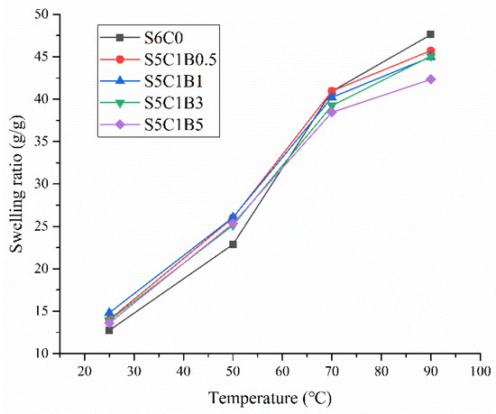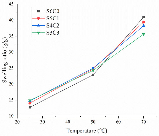 The swelling properties of different composite aerogels are detailed in Figure 6. It was observed that the swelling ratio of the starch–cellulose composite aerogel samples surpassed that of S6C0 at temperatures below the pasting temperature. However, it was lower than S6C0 when the temperature exceeded the pasting temperature. The incorporation of cellulose in the composite aerogel partially replaced starch, resulting in variations in the internal structure depending on the cellulose content. The water absorption of starch was restricted by the hydrogen bond between the starch and water molecules below the pasting temperature, thereby influencing the swelling ratio of the aerogel to some extent. Additionally, due to the relatively small pore diameter of the aerogel, the presence of cellulose enhanced the swelling ratio compared to S6C0. As the temperature surpassed the pasting temperature (e.g., 70 °C), the swelling ratio of the starch molecules in the pasted state gradually intensified. The internal structure of cellulose remained stable in hot water, therefore, the starch content directly impacted the volume of the aerogel above the pasting temperature. The data indicated a direct relationship between the starch content and the swelling ratio at a temperature of 70 °C. It was important to note that upon a continuous temperature increase to 90 °C, some fragmentation occurred among the samples with lower starch content, leading to the exclusion of the swelling ratio data at that temperature. Consequently, the uncross-linked aerogel samples exhibited low internal structural stability at high temperatures.