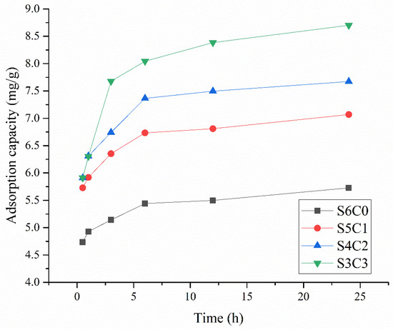 The curves depicting the adsorption of methylene blue over time for different starch-to-cellulose ratios are illustrated in Figure 8. It was evident that the initial starch aerogel exhibited the poorest adsorption performance. However, after the substitution of cellulose, the adsorption capacity of the sample improved, and there was a consistent increase in adsorption performance with higher cellulose content. Despite the fact that the introduction of cellulose powder relaxed the internal structure of the aerogel, it concurrently provided a larger specific surface area. This was attributed to the alteration of pore diameter, which enlarged as more cellulose was added. Additionally, the cellulose powder maintained its inherent morphology even after starch pasting, leading to an increased specific surface area for the composite aerogel as the proportion of cellulose powder rose. Notably, the S3C3 sample exhibited the highest adsorption capacity primarily due to the larger specific surface area of the cellulose powder. Although the addition of cellulose increased the size of the pores, it also enhanced the adsorption capacity of the aerogel.