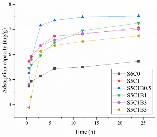 The relationship between methylene blue adsorption and time at different cross-linker contents is depicted in Figure 9. Comparing the adsorption of the S5C1 and S6C0 samples, it could be observed that the adsorption capacity of methylene blue gradually decreased as the amount of cross-linker increased. This could be primarily attributed to the significant structural changes induced by the addition of the cross-linking agent. On one hand, the addition of MBA increased the porosity of the aerogel and decreased the pore size, which was conducive to the adsorption of guest molecules. On the other, Figure 7 indicates that the water retention capacity of the formed composite aerogel samples was higher than that of raw aerogel at room temperature, which meant that more methylene blue remained in the aerogel and could not be released quickly. Consequently, S5C1B0.5 exhibited a higher adsorption capacity. As the amount of cross-linker was progressively increased, it exerted an inhibitory effect on the water absorption and swelling of starch due to the formation of strong chemical bonds. The water absorption and swelling of starch not only occurred at the molecular level, but also involved the entire external structure. With the increasing amount of cross-linker, the swelling was constrained, resulting in a reduction in adsorption. Ultimately, this led to a discrepancy between the specific surface area and the adsorption capacity.