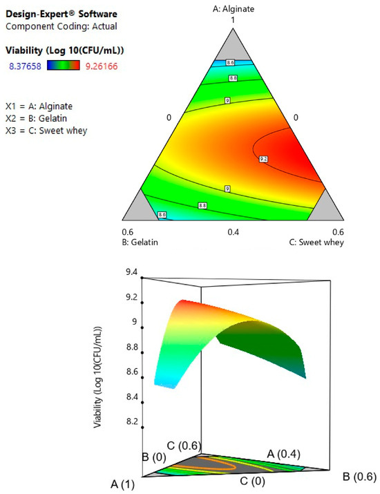 where Y is the predicted response variable (viability), and A, B, and C are the coded values of the proportion of alginate, gelatin, and whey in the mixture, respectively.