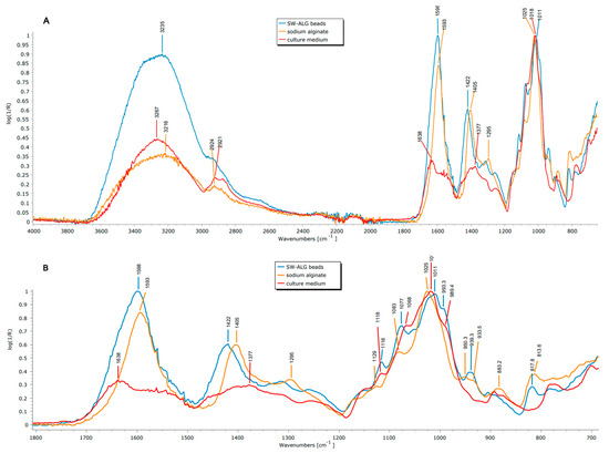 FTIR analysis of sodium alginate (ALG), culture medium—mainly sweet whey (SW)—and SW-ALG freeze-dried microcapsules: (A) full-range spectrum; (B) detailed region between 1700 and 700 cm−1.