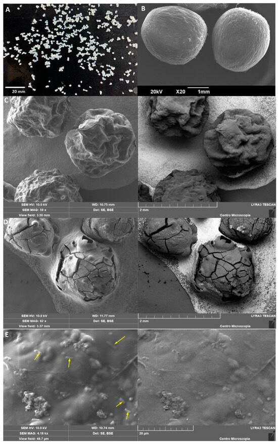 The morphology of the wet and dried beads was observed by SEM (Figure 3). Wet microcapsules showed a spherical shape without agglomerations and with a continuous surface without hollow areas or deep-crack morphology (Figure 3B), confirming particle size analysis. However, frozen and air-dried microcapsules slightly lose this spherical structure (Figure 3C,D, respectively), showing that the drying method affects the morphology of the beads. These results are in line with another study [43], which found that the loss of water determines the morphology of the final structure in each drying, as revealed by the contractions and small eruptions on the surface as a result of the massive loss of water (from 0.98 to 0.04 g H2O/g dry weight). The encapsulated L. fermentum K73 cells on the surface of the bead was directly observed to be covered by the matrix (Figure 3E).