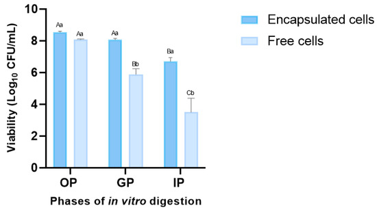 Viability of free and encapsulated L. fermentum K73 cells during OP (oral phase: 2 min, pH 7.0), GP (gastric phase: 120 min, pH 3.0), and IP (intestinal phase: 120 min, pH 7.0) according to the INFOGEST in vitro model. The mean value ± standard deviation of at least three independent measurements is included. (A–C) Different letters within the same treatment (encapsulated or free cells) indicate statistical significance between in vitro digestion phases (p < 0.05). (a,b) Different letters with the same in vitro digestion phase indicate statistical significance between treatments (encapsulated or free cells) (p < 0.05).