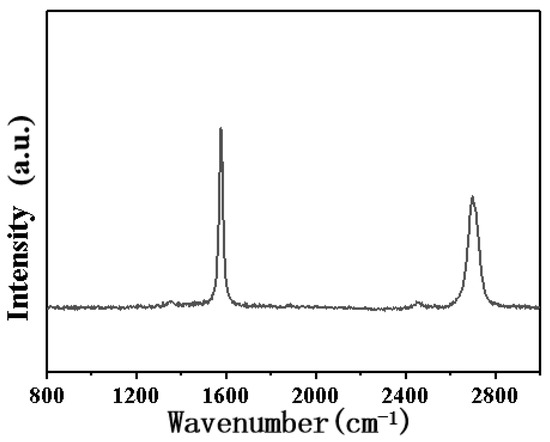 Similar to the research on the graphene deposited on catalytic metal substrates in the literature [6,28], two strong peaks for the G band at 1576.7 cm−1 and the 2D band at 2700 cm−1, together with a very weak peak for the D band around 1357 cm−1, could be observed in the Raman spectrum of 3DG (Figure 3). As the D band refers to the disorder carbon structure, and the relative intensities ID/IG could be used to evaluate the defect degree of carbonaceous structure, the Raman spectrum of 3DG confirms its high crystalline structure. Moreover, the intensity ratio (I2D/IG) of 3DG is 0.66, which is much less than 1, implying its multi-layered structure [6,7,29].