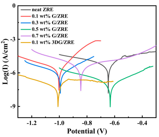The potentiodynamic polarization tests have been performed to characterize the corrosion inhibition behavior of various ZRE coatings. As shown in Figure 5, when incorporating G in the ZRE coating, the Tafel curves of all the samples move downwards, indicating the decreased corrosion current density (Icorr). Evidently, the lowest curve of the G/ZRE coating is the one containing 0.5 wt.% G. Based on Figure 5, the Icorr, corrosion potential (Ecorr), and polarization resistance (Rpo) of the coatings modified with different G content are obtained, and they are listed in Table 1. The Icorr value of neat ZRE is comparable with the other ZRE coating [30]. It can be found that, with the modification by only 0.1 wt.% G, the corrosion inhibition performance of the coating is already enhanced greatly, as its Icorr becomes to be only 1/3 that of neat ZRE coating. With the G content increasing from 0.1 to 0.5 wt.%, the Icorr of its ZRE coating decreases correspondingly (Figure 5). At 0.5 wt.% G, the Icorr of its ZRE coating is the lowest (7.14 × 10−7 A cm−2), which means a ~10-fold improvement in the corrosion resistance, comparing with that of neat ZRE (6.1 × 10−6 A cm−2). However, when further increasing the G content to 0.7 wt.%, the Icorr of its ZRE coating increases (Table 1). The increased Icorr of the coating could be due to the aggregation of G at high content, which deteriorates the barrier property of the coating. Additionally, the 0.5 wt.% G/ZRE coating displays the largest Rpo among all the G/ZRE samples. As a result, 0.5 wt.% is determined to be the optimal G content for modifying ZRE coating.