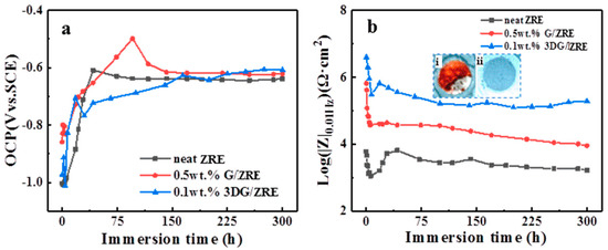 The long-term corrosion resistance behavior of the ZRE coating was evaluated by the immersion test. It was suggested that the open circuit voltage (OCP) of the ZRE coating could be used as a factor to evaluate their protection performance [31]. Figure 6a shows the variation of OCP values of the three ZRE through the 300 h immersion test. Initially, the values of all the coating samples are far lower than −0.6 V. All the OCP values of the ZRE coatings increase quickly within the first 2-day immersion. This could be due to the oxidation of zinc particles and the formation of the corresponding compounds as the corrosive species continuously penetrate into the ZRE coating. Theoretically, the cathodic protection function of the coating will be reduced by the generation of the less conductive corrosion products due to the destruction of electrical linkage between zinc particles. Comparing with neat ZRE and G/ZRE, it takes much more time (~170 h) for 3DG/ZRE to reach a relative stable value, which means more zinc particles are involved in the sacrificial anode-based cathodic protection process. These results confirm the pronounced effect of 3DG fillers on maximizing the cathodic protection of ZRE coating.
