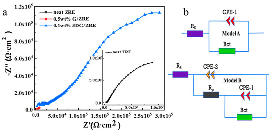 (a) Nyquist diagrams of neat ZRE-, G/ZRE-, and 3DG/ZRE-coated Q235 steel plates after 300 h immersion in the simulated seawater and (b) the equivalent circuit.