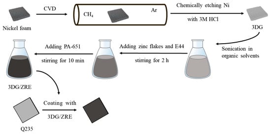 The whole process was illustrated as Scheme 1. As depicted in previous work [25], graphene foam was produced by the template-directed chemical vapor deposition (CVD) method following the removal of Ni foam. It was then used to prepare 3DG/ZRE paint. The epoxy composite paint comprised two parts, i.e., the component A (epoxy resin and Zn powder) and component B (polyamine curing agent, PA-651). For the fabrication of the modified paint, common graphene or graphene foam was firstly dispersed into epoxy resin diluent ultrasonically. After adding E-44 and Zn powder, the dispersion was magnetically stirred for 2 h. The paint was fabricated finally by mixing it with component B. In the paint composite system, organic solvent (xylene: n-butanol = 7:3) was used as the epoxy diluent and its mass fraction in the paint was 20 wt%. The mass fraction of E-44, zinc powder, and PA-651 is 30 wt%, 35 wt%, and 15 wt%, respectively. Depending on the fraction of graphene (0.1 wt%, 0.3 wt%, 0.5 wt%, and 0.7 wt%) or 3 DG (0.1 wt%), the resulted coatings were labeled as ‘the fraction G/ZRE’ or ‘0.1 wt% 3DG/ZRE’, respectively. Prior to being coated with the ZRE paint, Q235 carbon steel plates were sandblasted and washed with acetone. The paint was applied to the surface of the sandblasted Q235 plates by a rod applicator and cured in an oven at 60 °C for 24 h. Moreover, neat ZRE coating was prepared using the same method in the absence of any graphene filler.