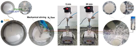 Sulfuric acid was used as a Brønsted catalyst for the esterification reaction with the proportion calculated based on the Cit amount in the mixture (0.33% m/m of the amount of Cit). The polyglycerol citrate (PGCit) polymers were synthesized via polycondensation reaction in an aluminum beaker as a reaction system (250 mL) and then sealed with parafilm under constant mechanical stirring (Fisatom 713DS, São Paulo-SP, Brazil) on a heating plate (SP Labor, Presidente Prudente-SP, Brazil) and under a nitrogen atmosphere, as shown in Figure 1. All the syntheses followed the same conditions: addition of the Cit, Gly, and catalyst or not into the reaction system followed by heating the reaction mixture to 130 °C for 5 min and then to 140 °C for 20 min. After completion of the synthesis, the products were cooled to room temperature and stored in plastic bags for further analysis. The name, reagent mix ratio, and method of each synthesis can be seen in Table 1.