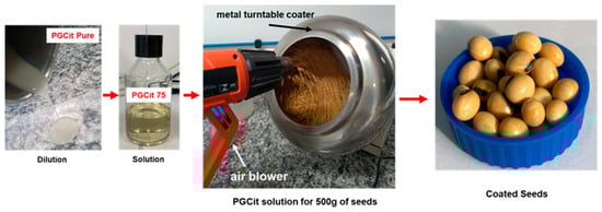 The germination and preliminary tests on the soybean coating with PGCit showed good adhesion characteristics, a reasonable germination rate, and no seed toxicity. When treated, the PGCit polymer-coated seeds had germination rates of about 84.52 ± 2% compared to 86.08 ± 4% for untreated seeds.