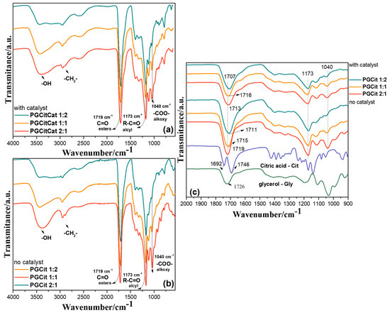 Normalized FTIR spectra of samples synthesized at 140 °C for (a) PGCit with catalyst, (b) PGCit no catalyst, and (c) zooming at 2000–1500 cm−1 for PGCit polymers and their monomers, glycerol and citric acid.