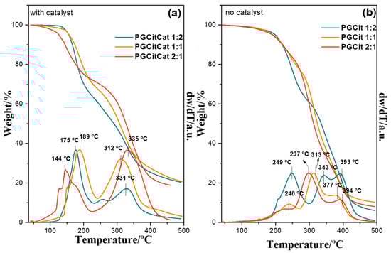 Thermogravimetry (TGA) and derivative thermogravimetry (DTG) of weight curves of polyglycerol citrate polymers: (a) PGCit with H2SO4 catalyst and (b) PGCit without catalyst.