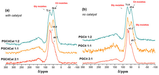 The 13C NMR for Gly in solution is at 63.2 (C1 and C3) and 72.4 ppm (C2), and for Cit, it is at 43.6 (Cβ) and 73.2 ppm (Cα) (Figure S2, Supplementary Material) [18,34]. Therefore, the 13C NMR peak at 72 ppm in the solid state for the samples with and without a catalyst can be assigned to the Gly (C1, C2, and C3) and Cit (Cα), and the peak at 50 ppm can be assigned to Cit carbon (Cβ). The Gly carbons (C1 and C3) with very high mobility can be seen at the PGCit 2:1 at approximately 63 to 64 ppm.