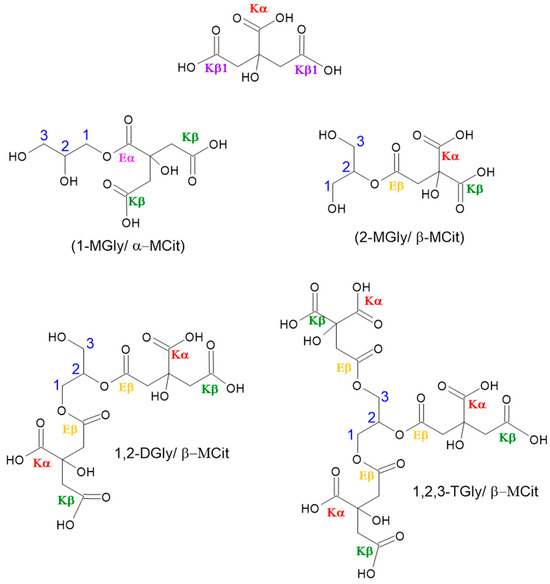 Illustration of proposed oligomers with different citrate and glyceryl formations (monoglycerides—MGly, diglycerides—DGly, and triglycerides—TGly. Citric acid (Cit) bonded by α and β COOH groups (α-MCA (mono-citrate) or β-MCA, respectively). Eα or β, esters, and Kα or β, acid groups from α or β COOH groups [37]. The numbers in blue identify the carbon of glycerol that was reacted.