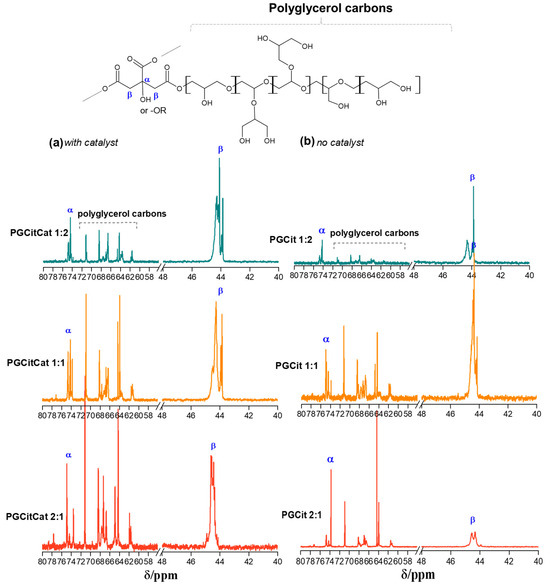 13C NMR spectra of PGCit materials obtained (a) with and (b) without catalyst and the polyglycerol citrate region of polymerization.