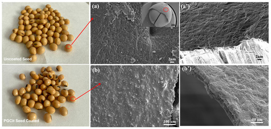 SEM image of (a) the soybean seed before being coated (a’) high magnification and (b) after being coated with PGCit polymer, (b’) high magnification of coated seeds.