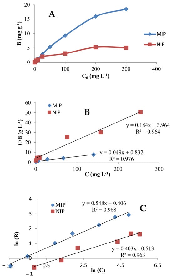 (A) Adsorption isotherm of MIP and NIP using batch adsorption assay. (B) is the binding of cloxacillin per g of polymer, (C0) is the initial cloxacillin in the medium. (B) Langmuir isotherms linearized for cloxacillin adsorption onto MIP and NIP. (C) Freundlich isotherms linearized for cloxacillin adsorption onto MIP and NIP.