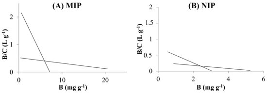 The Scatchard plot is used to determine the number and type of binding sites of the polymers. This estimated model is often used in solid-phase extraction to characterize the maximum amount of adsorption and the dissociation constant. The binding data were linearly transformed according to the Scatchard equation [].