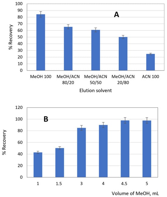 Optimization of MISPE. (A) Solvent elution. (B) Volume of MeOH as optimum solvent elution.