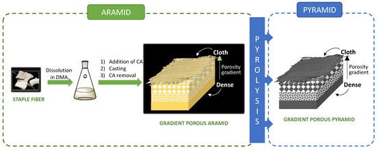 We have pioneered the production of controlled porosity aromatic polyamides as conventional materials (not gradient porous materials), ranging from nanoporous to microporous structures, and using standard solution casting procedures. Furthermore, we have developed a scalable and cost-effective preparation procedure utilizing porosity promoter polymers [41,42,43]. Currently, we are introducing the production of gradient porous aramids (GP-Aramids) and gradient porous pyrolyzed aramids (GP-Pyramids), opening the door to their future applications. These materials have been prepared using both m-aramids and p-aramids in various formats and shapes, including continuous and discontinuous fabrics, as well as dense or porous films, as illustrated schematically in Figure 1.