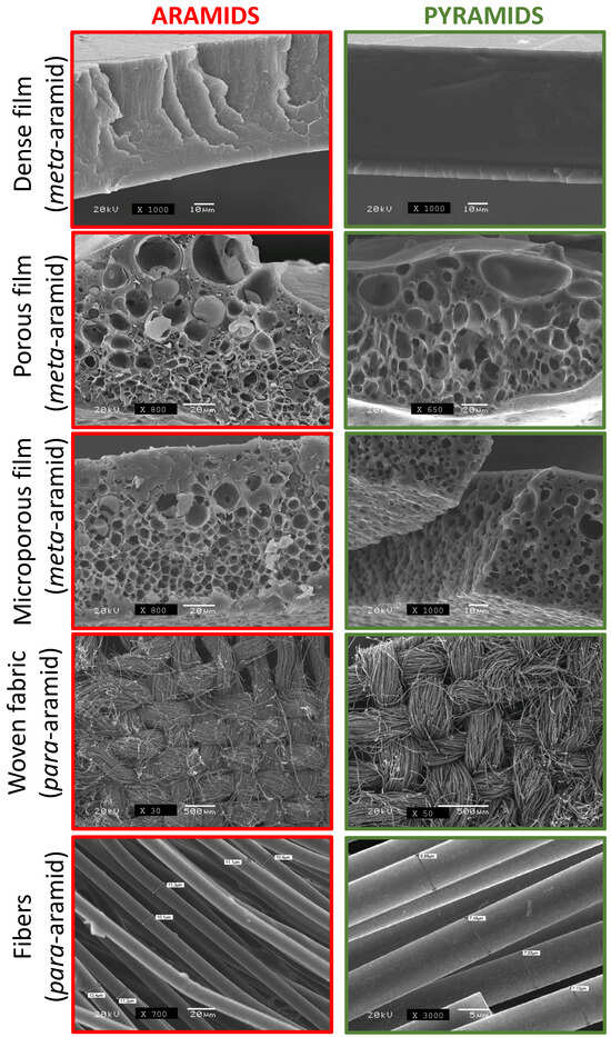 SEM images of aramids and pyramids in different formats (dense film, porous film, microporous film, woven fabric, and fibers).