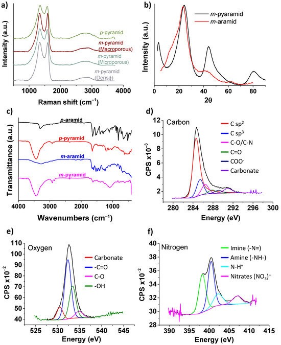 (a) Raman spectra of meta- and para-pyramids. (b) XRD spectra of m-aramid and m-pyramid. (c) FTIR of m- and p-aramids and m- and p-pyramids. (d–f) XPS high-resolution spectra corresponding to carbon, oxygen, and nitrogen, respectively, in dense m-pyramid.
