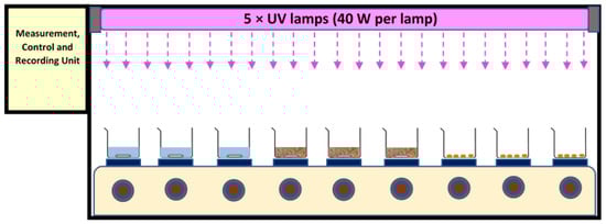 A test chamber (120 cm × 30 cm × 50 cm for length, width, and height, respectively) with shiny (mirror type) steel plates at its inner body was used. It was equipped with five UV lamp fittings, nine magnetic heater stirrers, temperature and UV intensity sensors, and a control and recording unit. The temperature was controlled online by the sensors under the sample containers as well multi-point measurements inside the chamber. Apart from this, periodically, sample temperature was measured with the help of thermometers. The high flux of UV light caused all the UV records to be out of range of the sensor. Thus, the UV radiation flux was calculated and reported based on the power of the lamp. The area of the chamber was 0.36 m2 (120 cm × 30 cm). Exposure times of 24 h and 48 h were applied. Five UV-A (340 nm, Philips, Amsterdam, The Netherlands) or 5 UV-C lamps (254 nm, Mazda, GE, USA) (40 W per lamp) were used separately in the different experiments, positioned approximately 30 cm above the water and bio-solid samples, and approx. 35 cm above the air samples—see Figure 1 for schematic of setup.