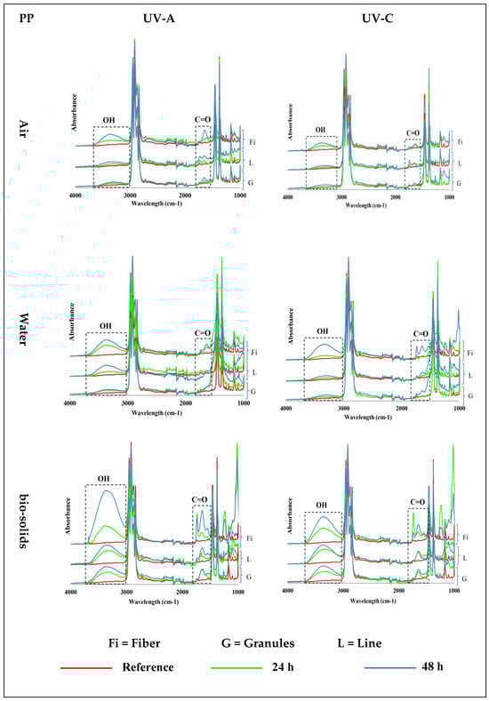 PP samples exposed to UV-A and UV-C at 70 °C in air, water, and bio-solids showed the emergence of carbonyl (C=O, ~1700 cm−1) and hydroxyl (OH, ~3300 cm−1) groups (Figure 2)—see Figure S3 for 400–4000 cm−1 wavenumber region. The PP samples exposed in the air environment (first control) showed an increasing formation of C=O and OH groups with an increasing exposure time. The results also showed an effect of the physical shape on the formation of these groups, with the fibres showing more of these groups than the lines, followed by the granules. In general, the intensity of the formed groups was low in the line and granule samples.