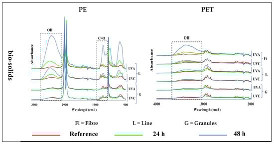 The exposure of different PET samples to different exposure conditions only produced changes in the fibers and lines in the bio-solids, leading to an increased abundance of hydroxyl groups, which increased with exposure time. No changes were observed in the other samples (Figure 3)—see Figure S3 for 400–4000 cm−1 wavenumber region.