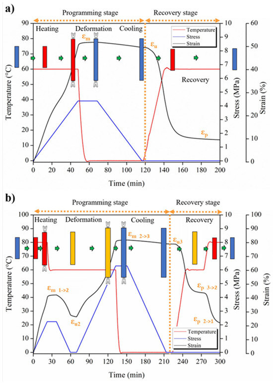 Schematic description of the thermo-mechanical cycle for studying the dual-shape memory (a) and the triple-shape memory effect (b).