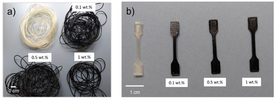 Macroscopic images of (a) unreinforced filament and 0.1, 0.5, 1.0 wt.% MWCNTs of the nanoreinforced filament; (b) unreinforced specimens and 0.1, 0.5, 1.0 wt.% MWCNTs of the manufactured Surlyn® nanoreinforced specimens.