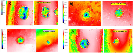 Figure 3 shows how the material heals the induced damage caused by the indentation, decreasing the depth of the damage from the center part of the hole. The blue color in the images, representing the maximum penetration zones (in the middle of the residual print), decreases after the thermal healing treatment.