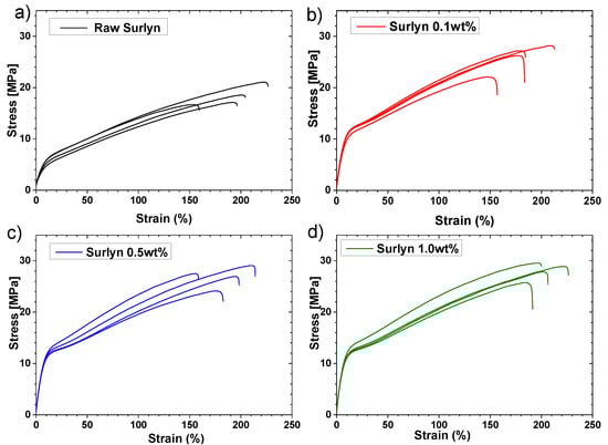Stress–strain curves of (a) unreinforced Surlyn® specimen, (b) 0.1, (c) 0.5, and (d) 1 wt.% of MWCNTs Surlyn® specimens.