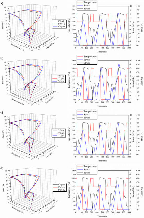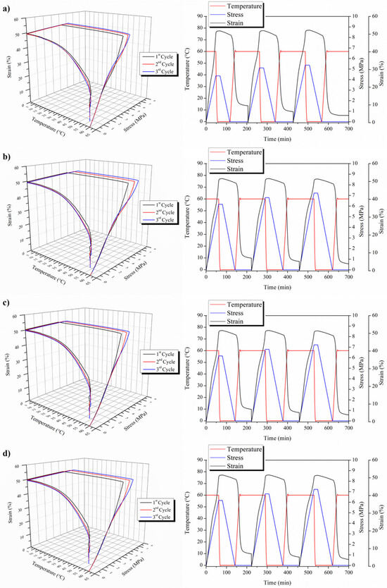 From Table 4, it is possible to point out the very good capability of 3D-printed Surlyn®-based materials, evidencing an optimal strain fixity ratio higher than 94% in both neat and MWCNT-nanoreinforced materials in all three thermo-mechanical cycles, indicating their optimal capability for fixing their temporary shape. The strain recovery ratio presents values very close to 90%, evidencing the good capability of the 3D-printed samples to recover their initial shape. However, based on our previous study [47], we can check the triple-shape memory effect on Surlyn®-based materials; therefore, Figure 9 reports the triple-shape memory responses for both 3D-printed neat and MWCNTs-reinforced Surlyn®. Both 3D diagrams and the time evolution of the thermo-mechanical cycles are reported for each sample. In this case, we have two switching temperatures, that is 60 and 80 °C, as well as two temporary shapes at 40% and 80%, respectively.