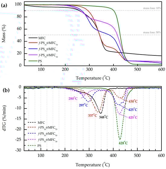 The TGA and dTGA curves of f-PS@MFC samples are presented in Figure 1.