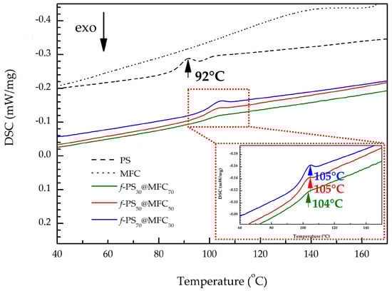 DSC thermograms of PS, MFC, and f-PS@MFC composites; the arrows indicate the corresponding temperatures of PS glass transition. The mass of each sample: 20 mg; the heating rate: 10 °C/min.