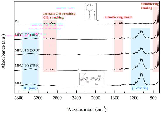 FTIR spectra of PS, MFC, and f-PS@MFC composites; the most intense bands referring to the PS and cellulose functional group oscillations are highlighted by red and blue, respectively.