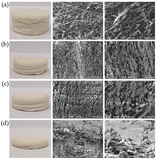 The obtained s-PS@MFC composites might be a more “green” alternative to the actual water sorption materials; hence, comprehensive investigations of their structure and characteristics such as porosity and water uptake are of great importance [,,,]. According to Figure 5, the volumes and, hence, the densities of the s-PS@MFC samples obtained under the same loading were different. The SEM micrographs in Figure 5 revealed the structure of the obtained hybrid sponge materials. For the sake of comparison, a control sample containing only MFC (s-MFC) prepared following the same technology described in Part 2.4 was introduced. The SEM investigation proved our assumption on the role of PS as a glue for the neighbor fibrils: a SEM micrograph of s-MFC revealed neat/uncoated cellulose fibrils, while in the composites, the surface coverage of MFCs increases with an increasing PS content.