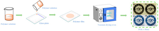 The PEK-Inx and PEK-BPFx films are prepared by the solution casting method (Figure 1). PEK-Inx and PEK-BPFx were dissolved in DMAc with a solid content of 20–25%. The mixture was dissolved for 12 h at room temperature. The polymer solution was filtered through a filter cloth and then cast in a clean glass plate. The glass plates were dried in an oven at 60 °C, 80 °C, 100 °C and 120 °C for 2 h, respectively. The film was peeled from a glass plate and dried in a vacuum oven at 180 °C for 24 h to obtain transparent films with a thickness from 50 to 70 µm.