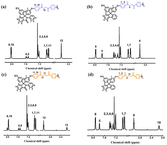 1H-NMR spectra of (a) PEK-InBFB, (b) PEK-BPFBFB, (c) PEK-InDPFP, and (d) PEK-BPFDPFP.